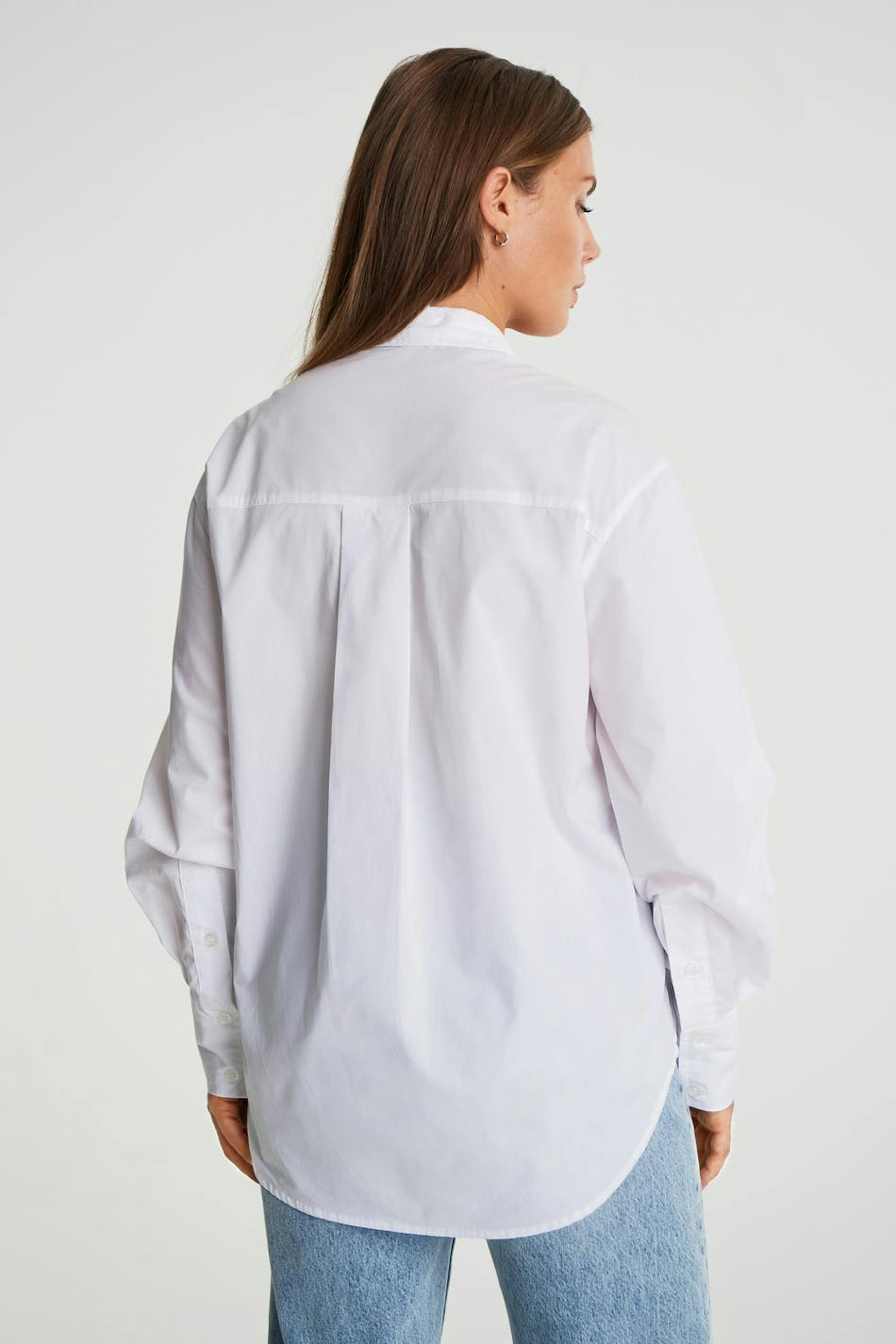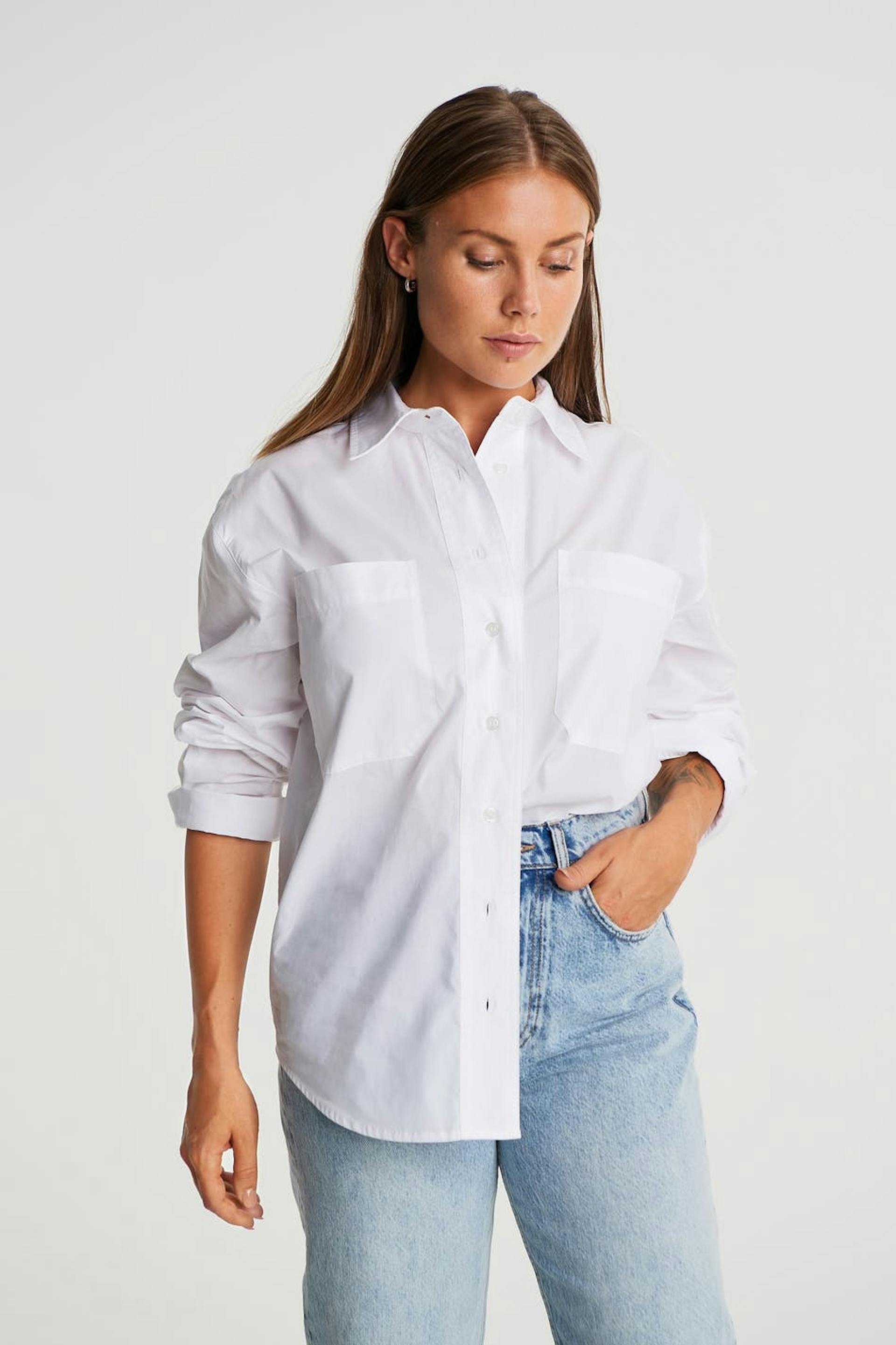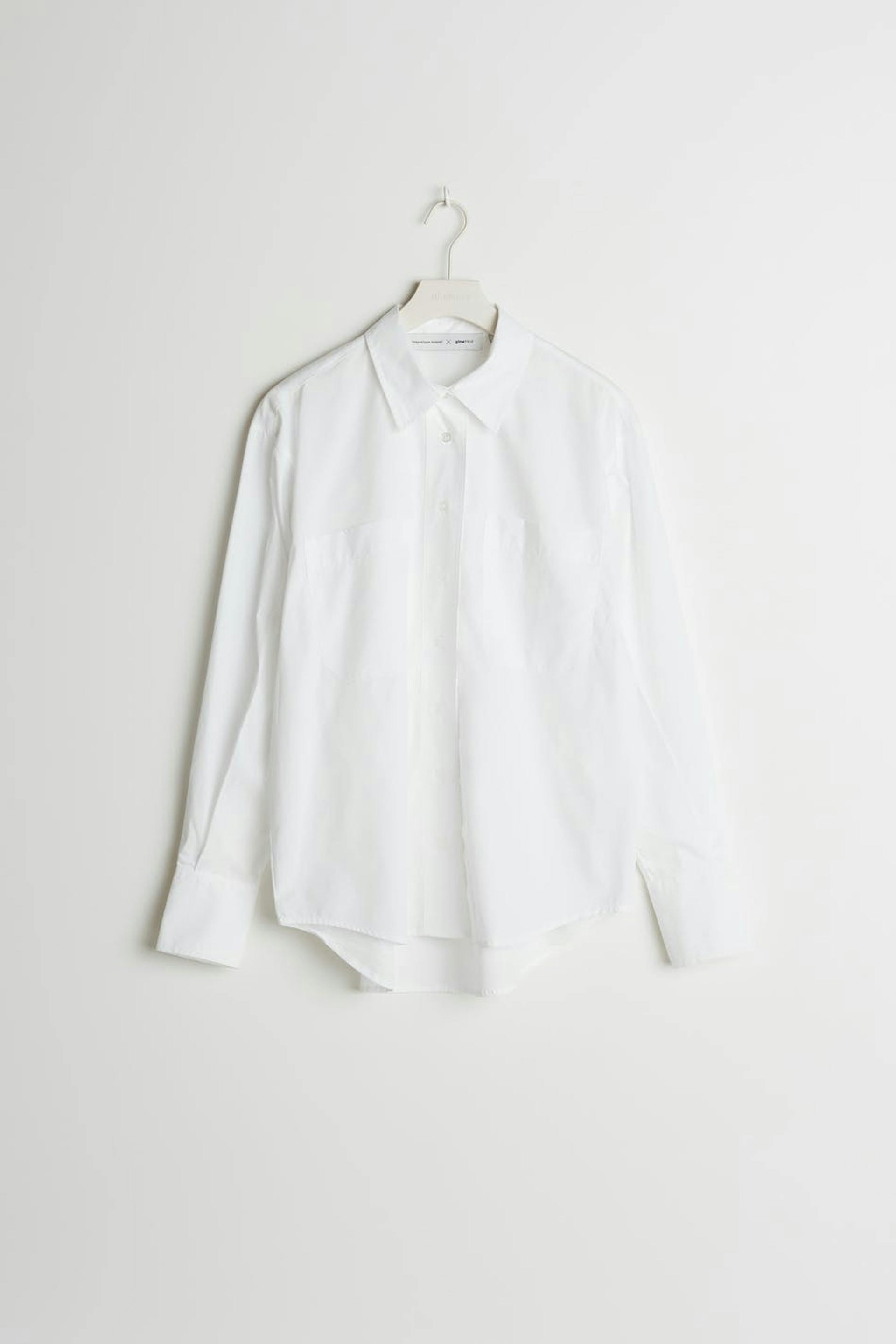 Maja X Gina tricot. Långärmad skjorta med bröstfickor. Skjortan är vit och har knappdetaljer vid ärmsluten.