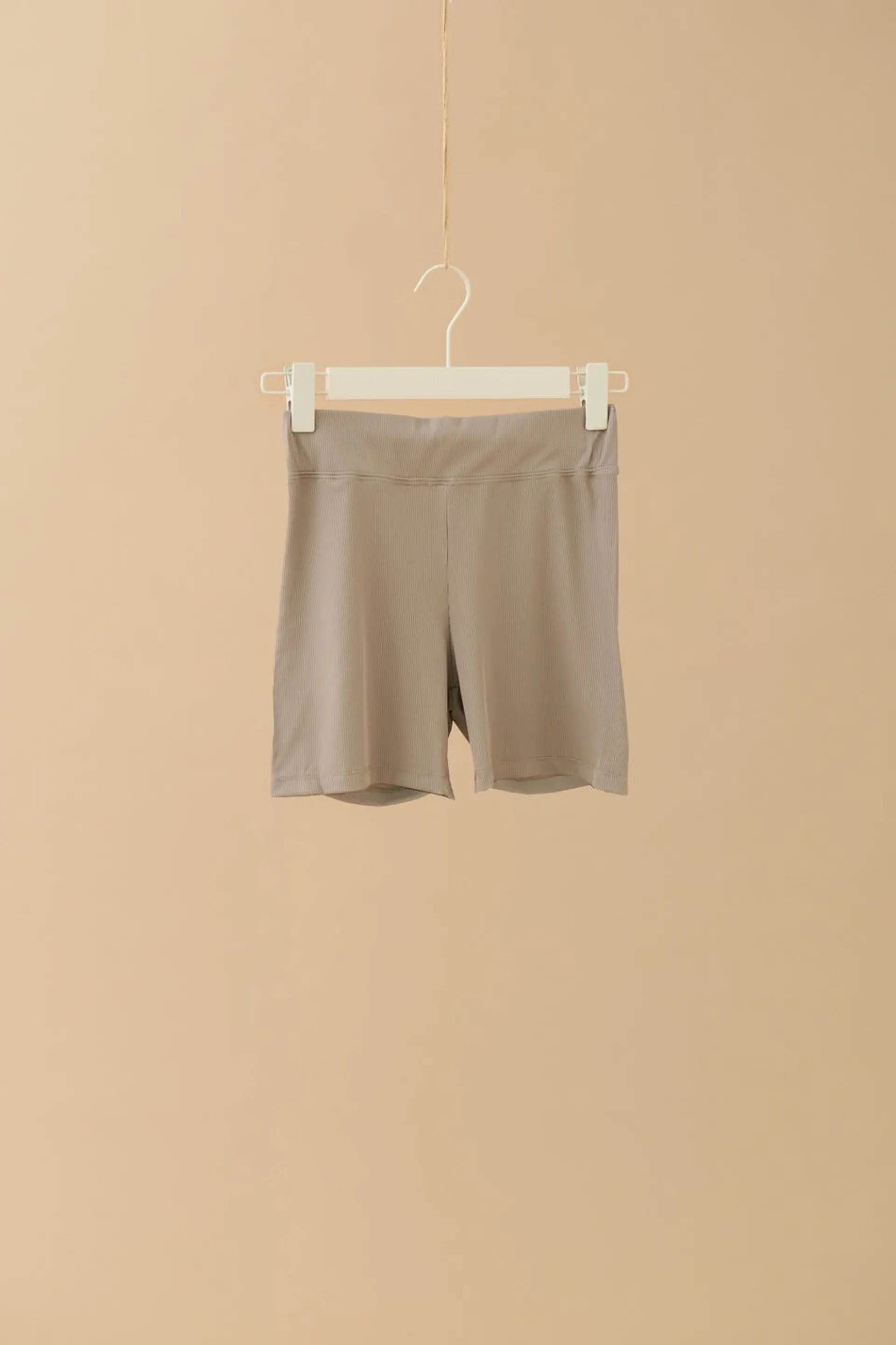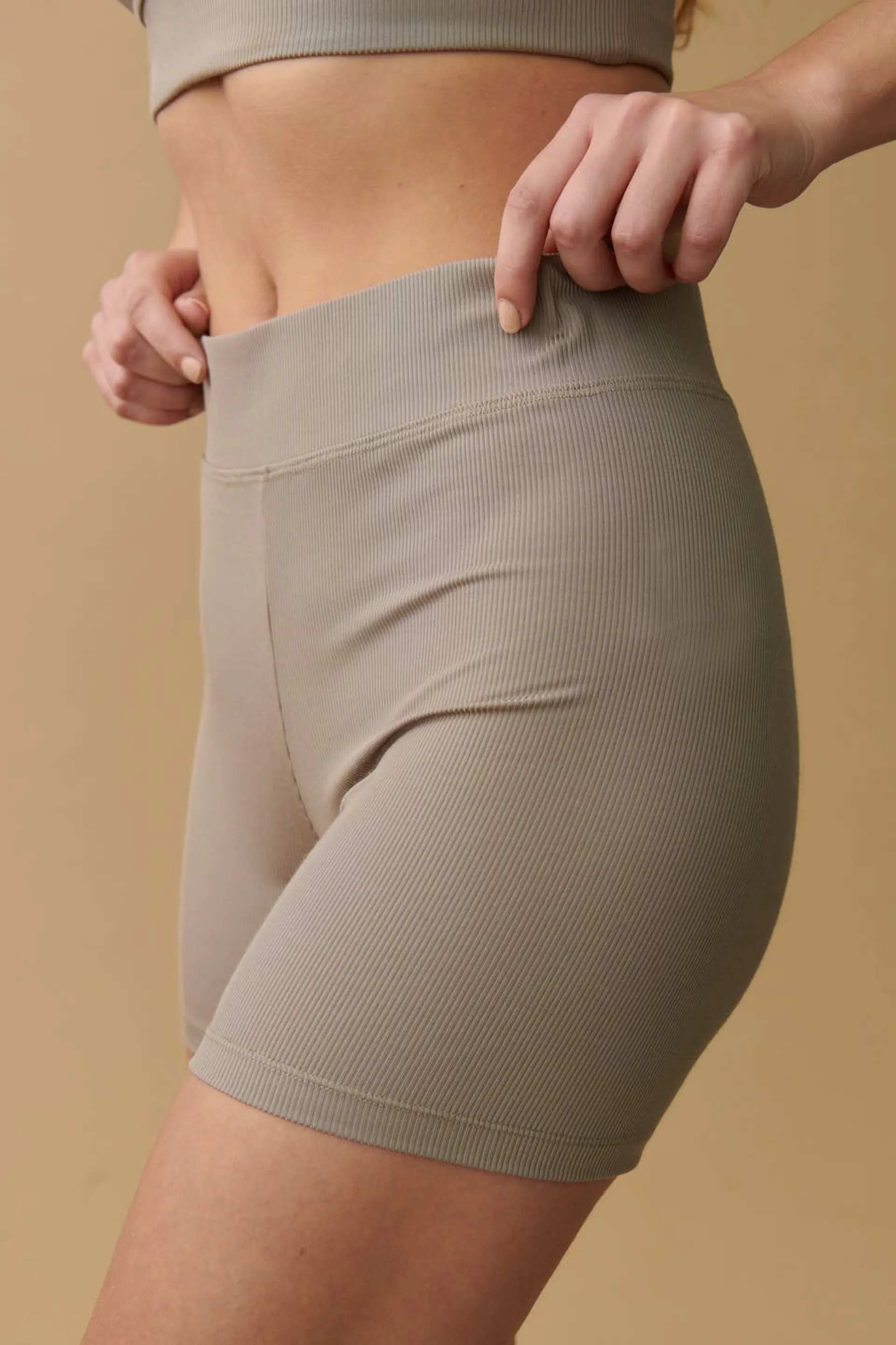 Allvar X Gina Tricot. Ribbade bikershorts med brett midjeband. Shortsen är beigea och har en mjuk kvalitet i trikå. Samtliga plagg i kollektionen är lokalt producerade i Borås, Sverige och skapade av träfibrer från de svenska skogarna.