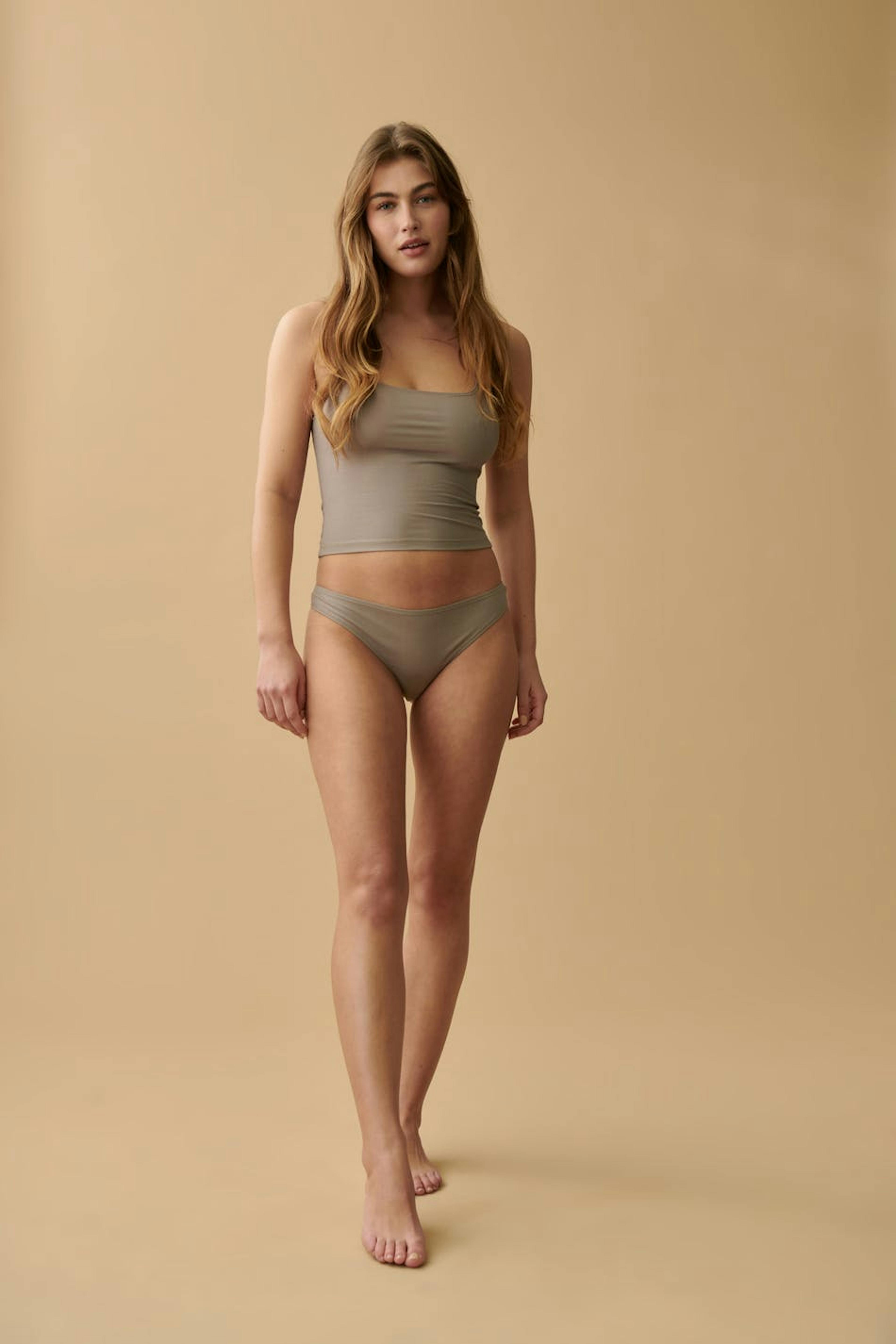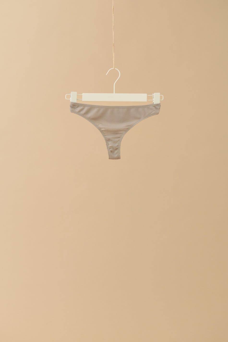 Allvar X Gina Tricot. Stringtrosor med fodrad gren i bomull. Stringtrosorna är beigea och har en mjuk, ribbad kvalitet. Samtliga plagg i kollektionen är lokalt producerade i Borås, Sverige och skapade av träfibrer från de svenska skogarna.