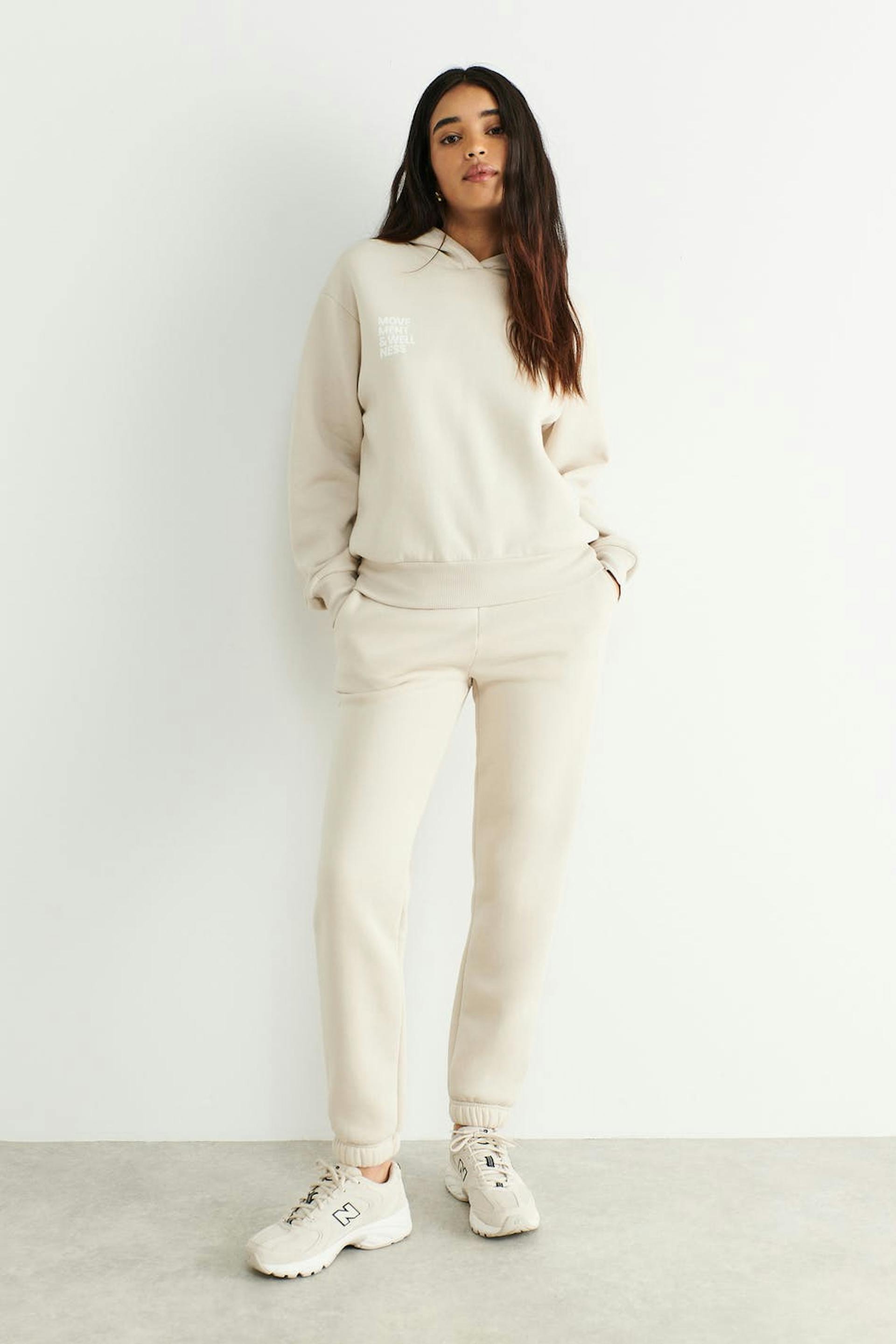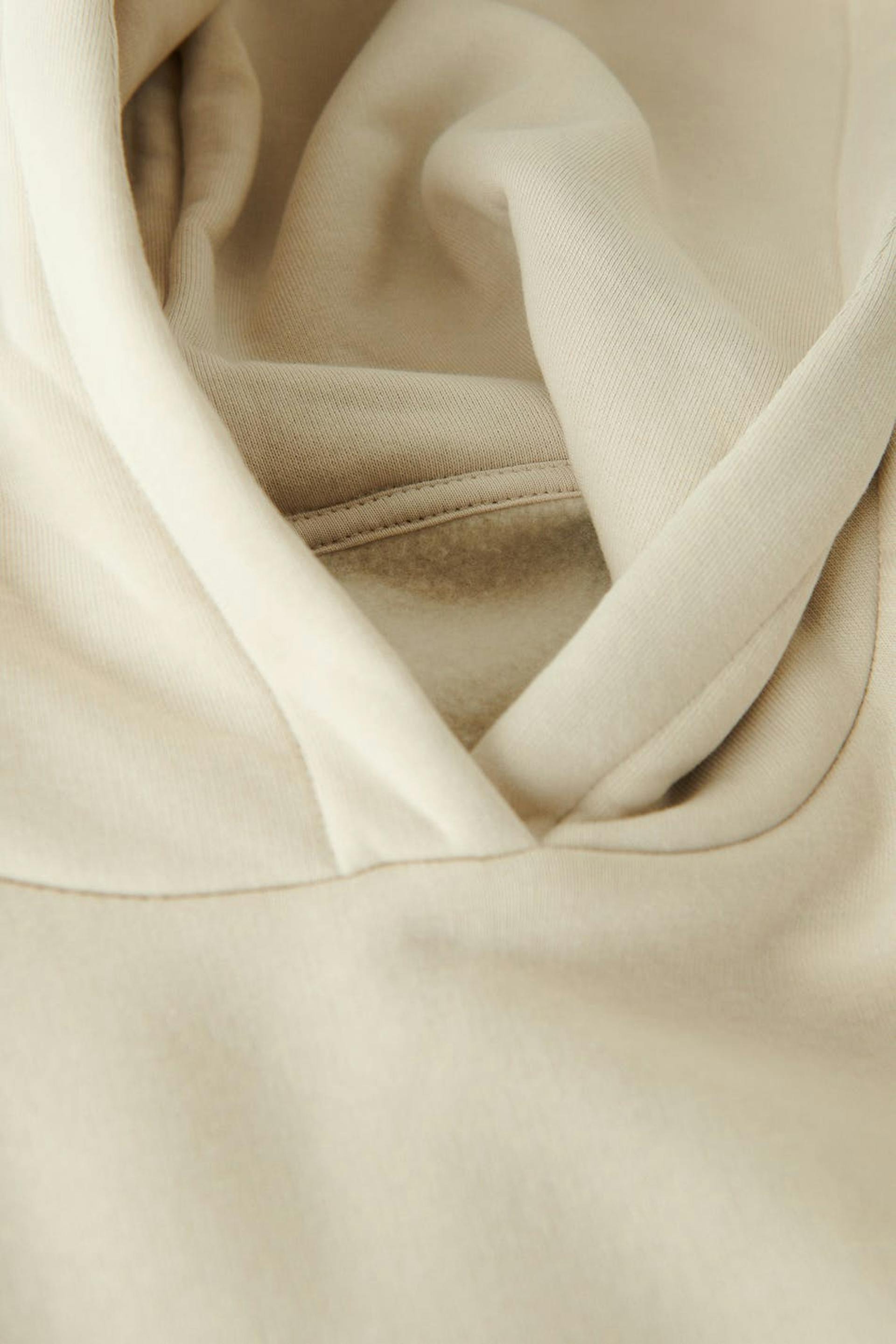 Oversized hoodie med nedhasade axlar. Hoodien är beige och har en fodrad huva. Den har en ribbmudd nedtill och vid ärmsluten.