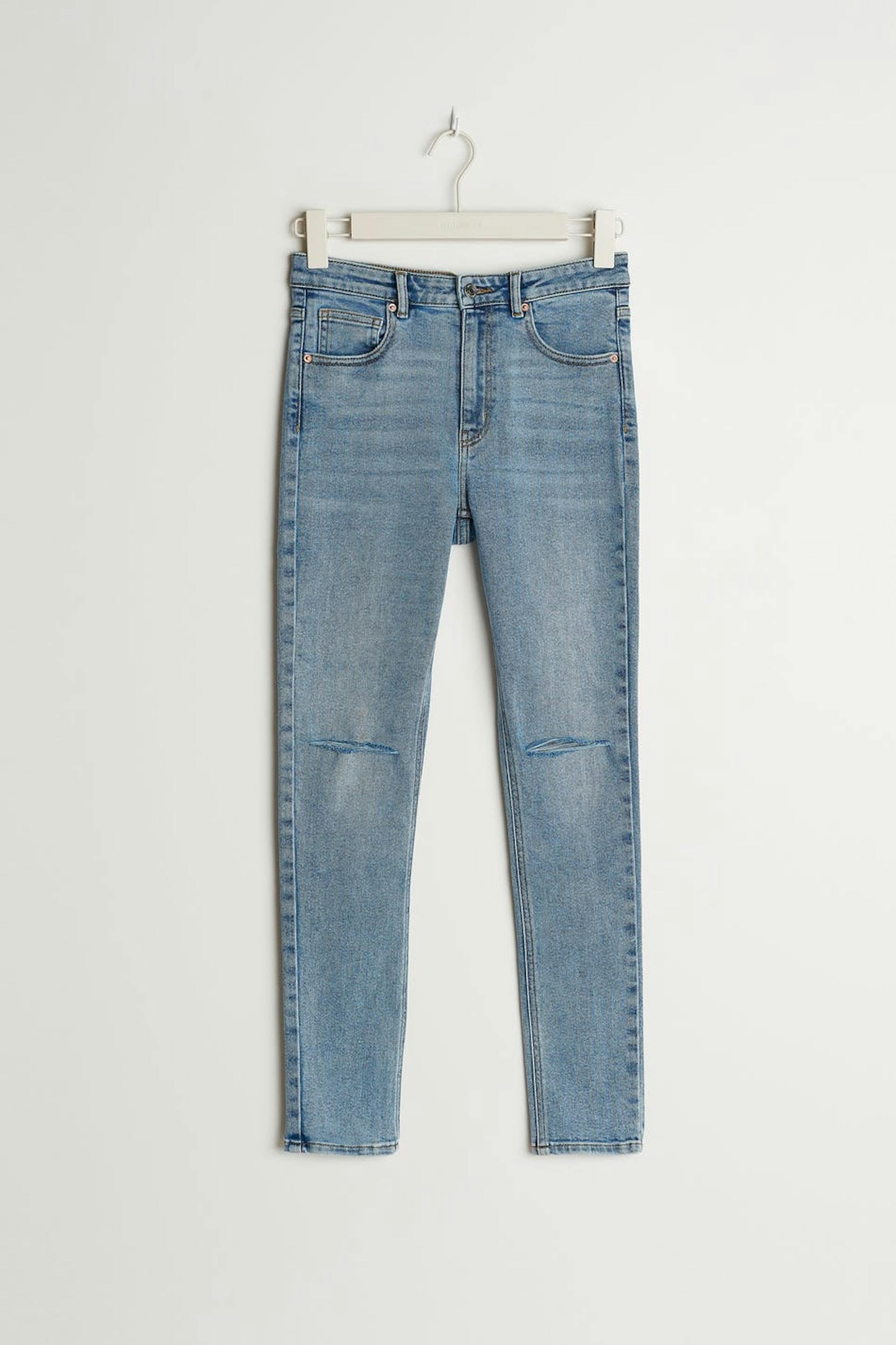 Skinny-jeans från vårt Young-sortiment med slitna knän. Skinny-jeansen är blåa och har en hög midja. De har en figurnära passform, smala byxben med en ankellängd, dragkedjegylf, en justerbar resår i midjan och fickor fram och bak.