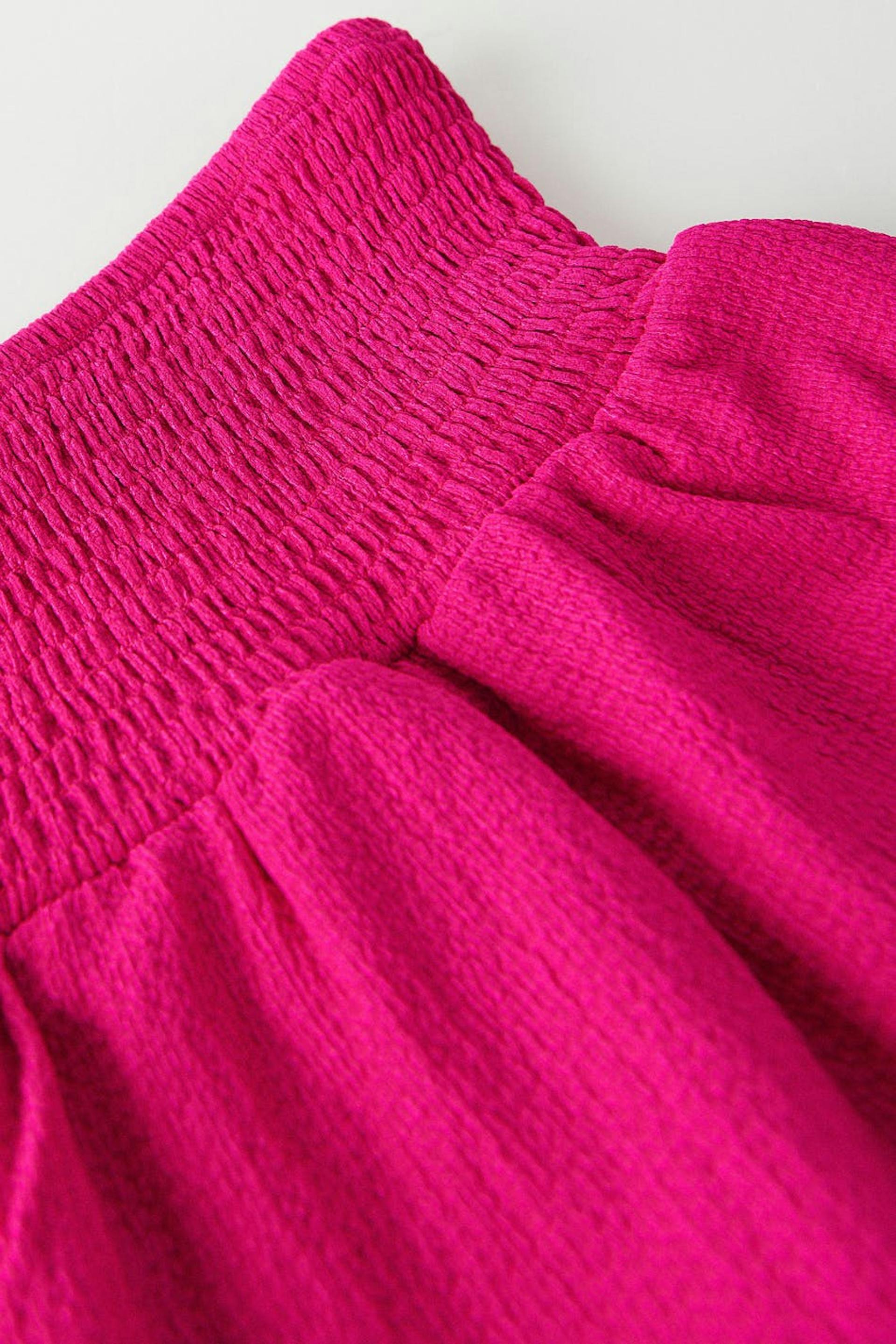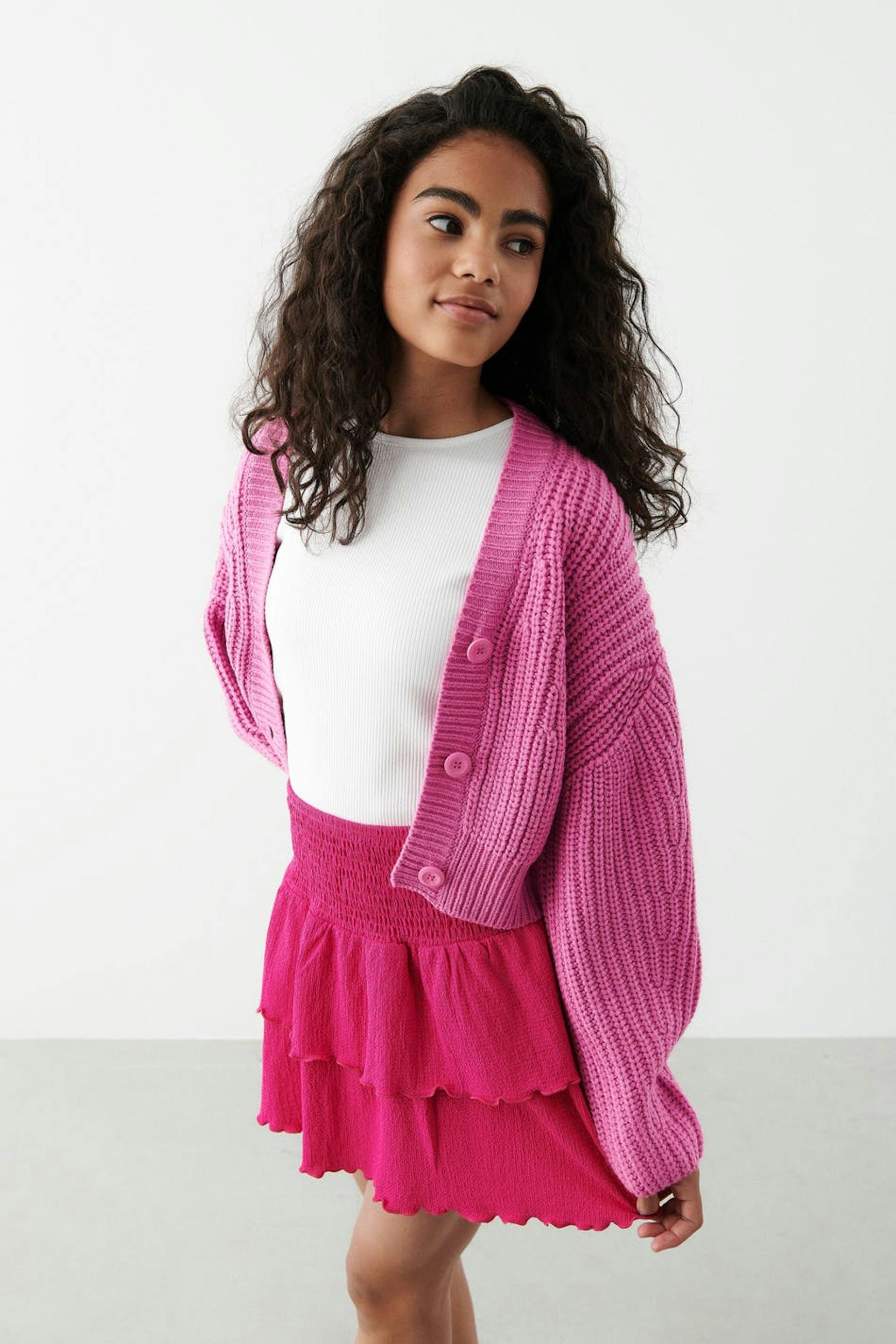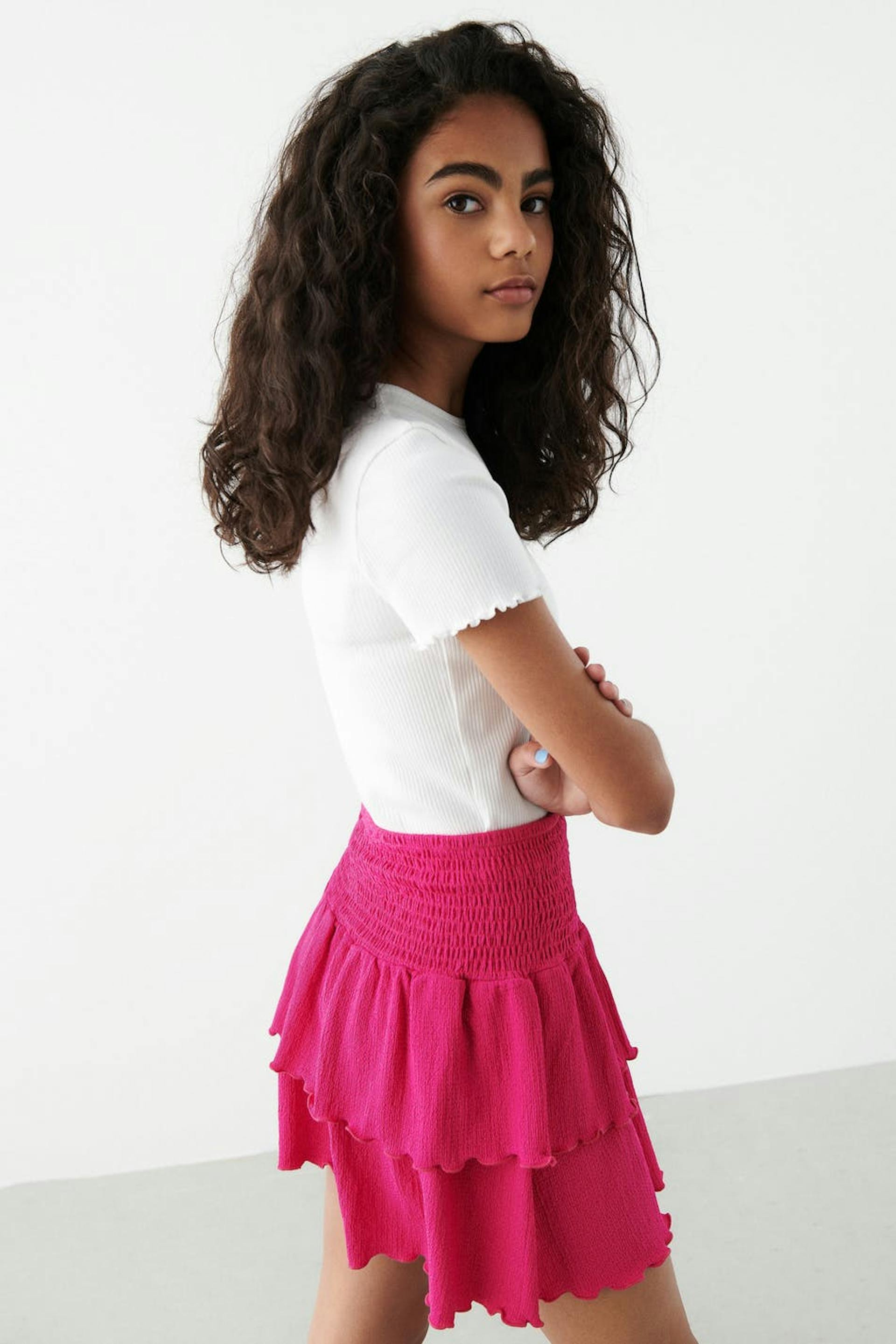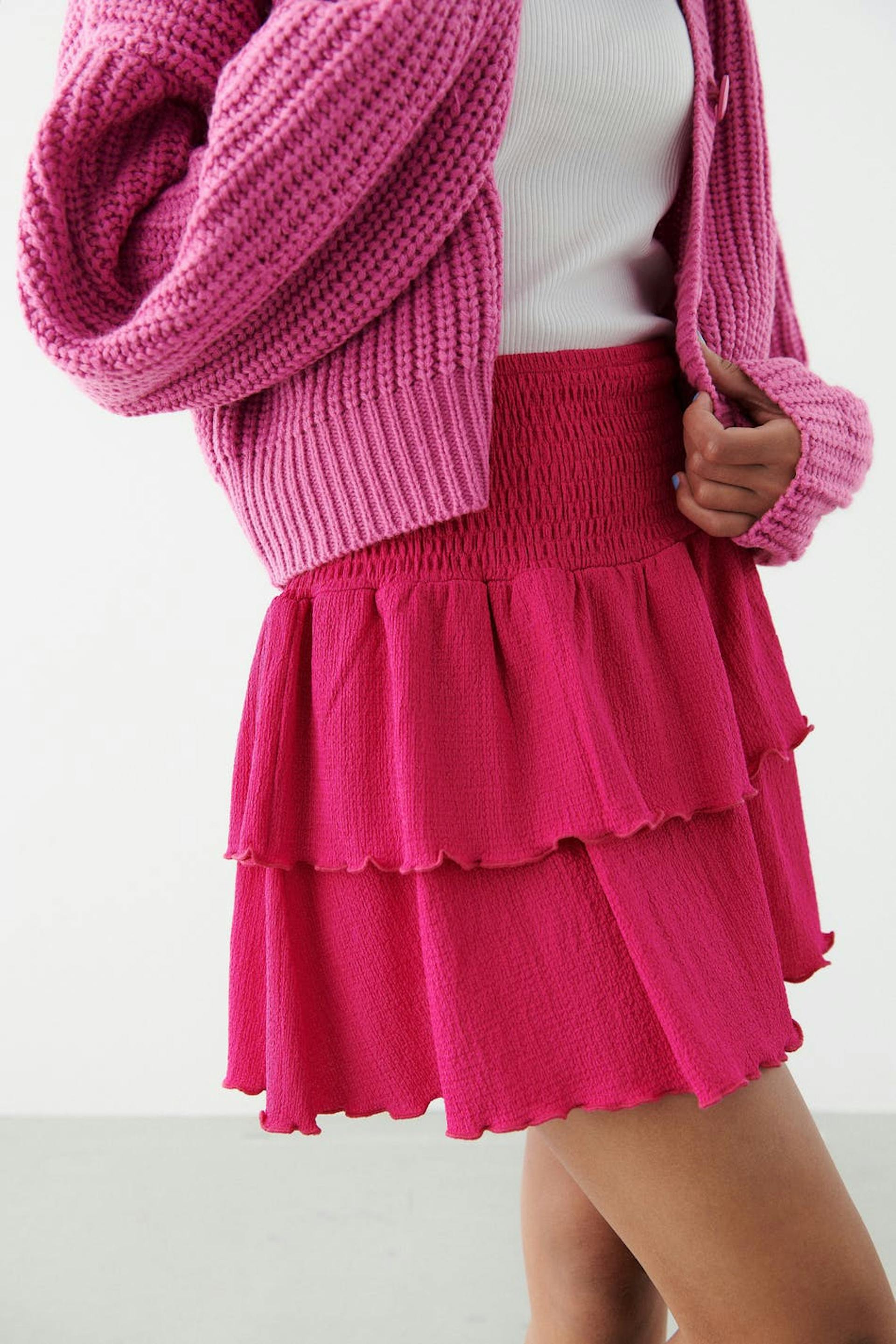 Kort volangkjol i trikå med en normal passform. Kjolen är rosa och har en smock i midjan. Den har volanglager med lockad nederfåll.