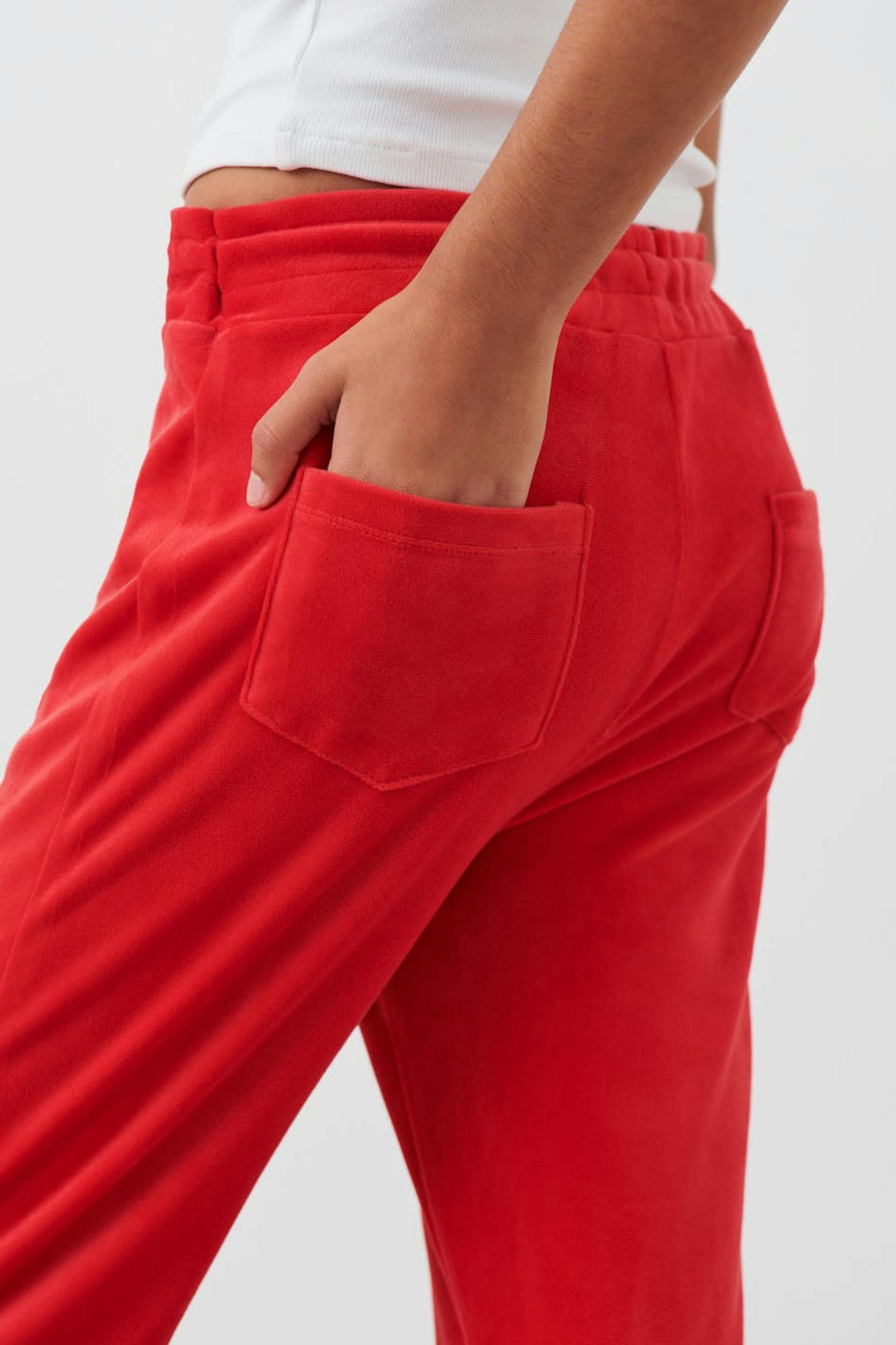 Mysbyxor i velour med normal passform. Byxorna är röda och har bakfickor. De har resår i midjan med knytbar dragsko framtill.