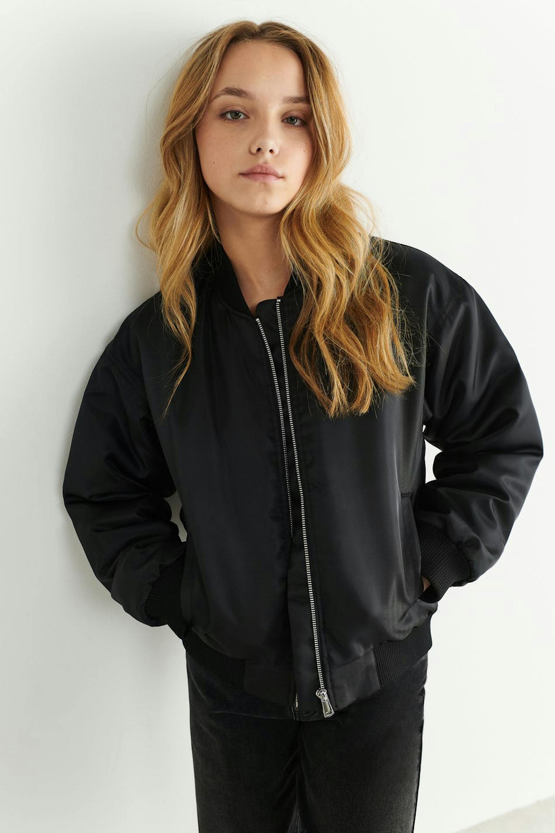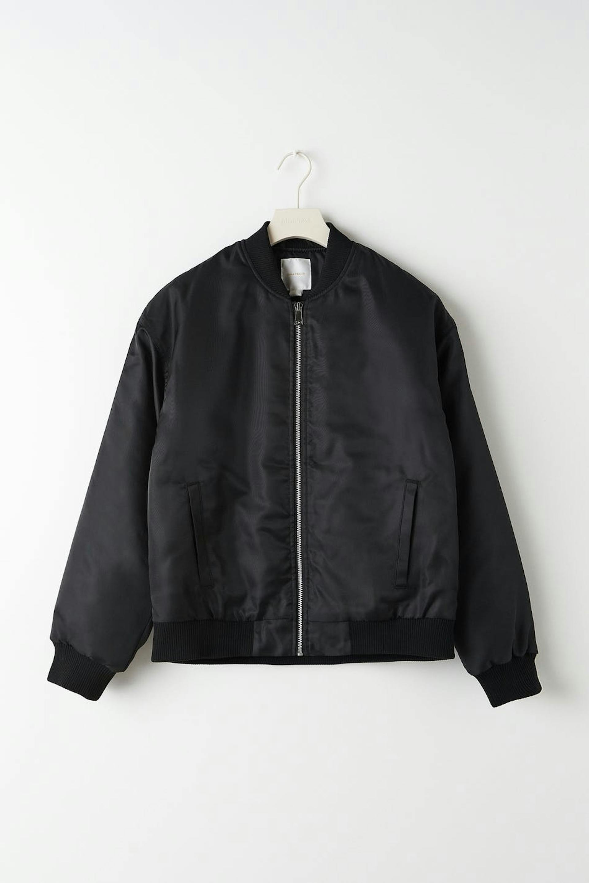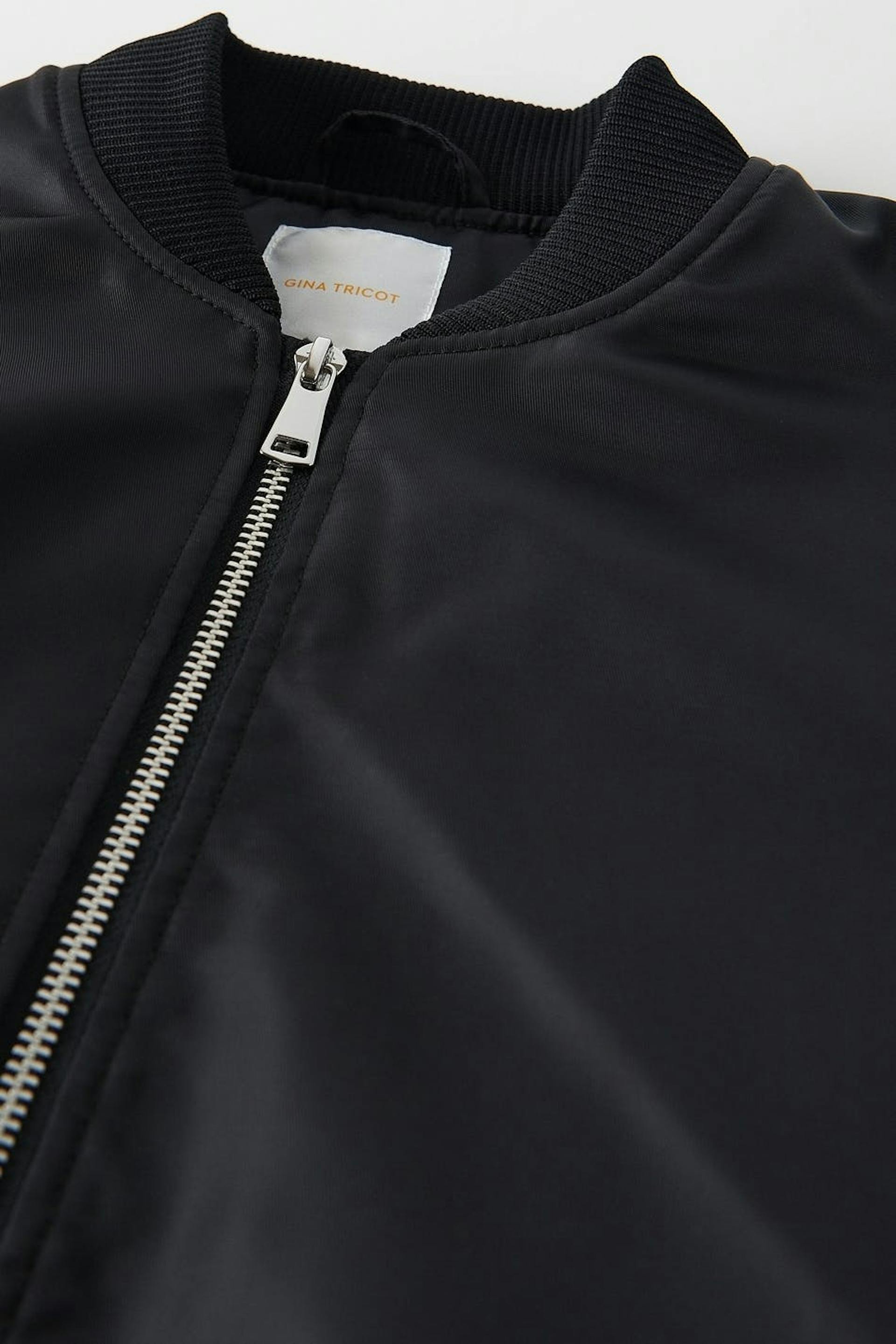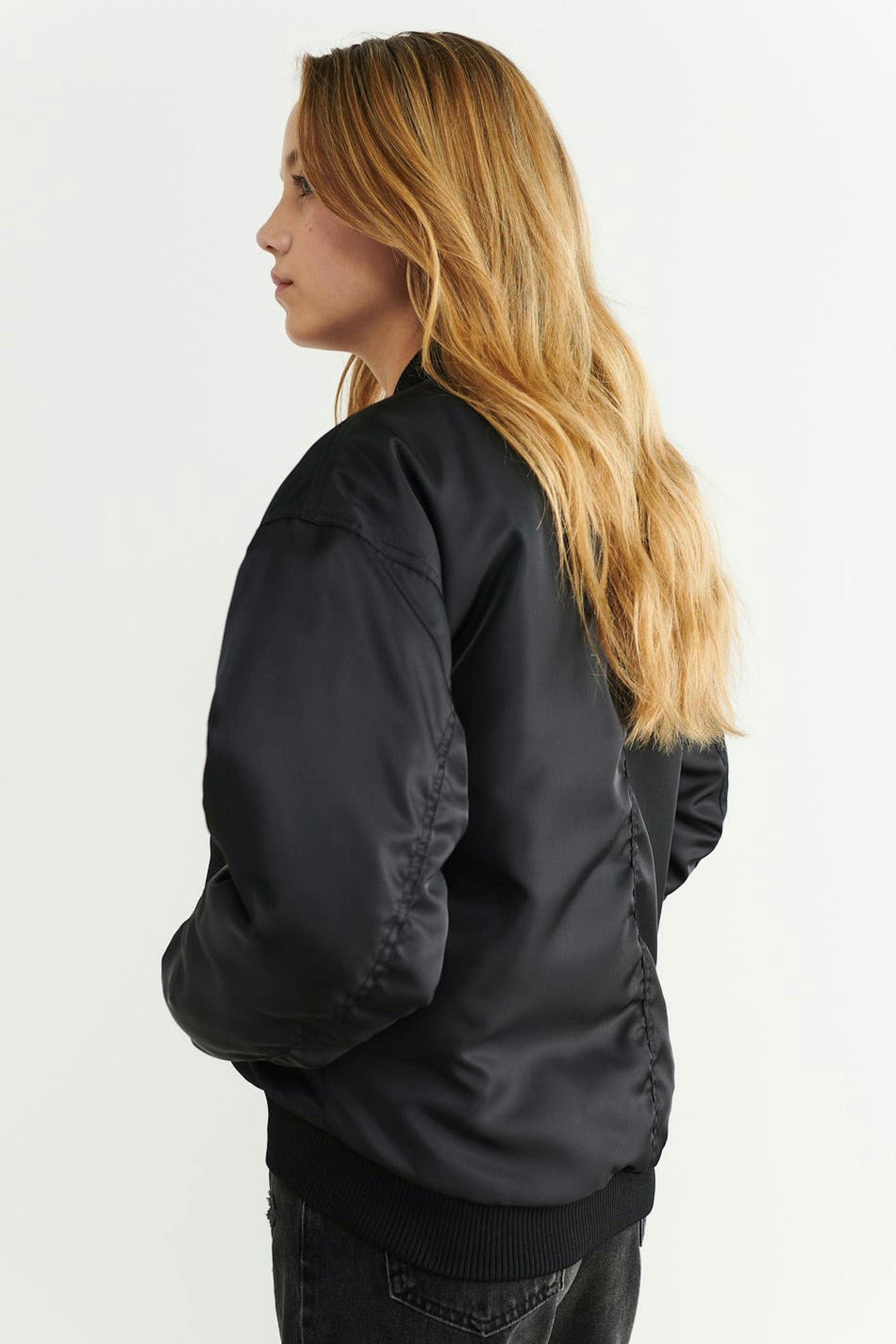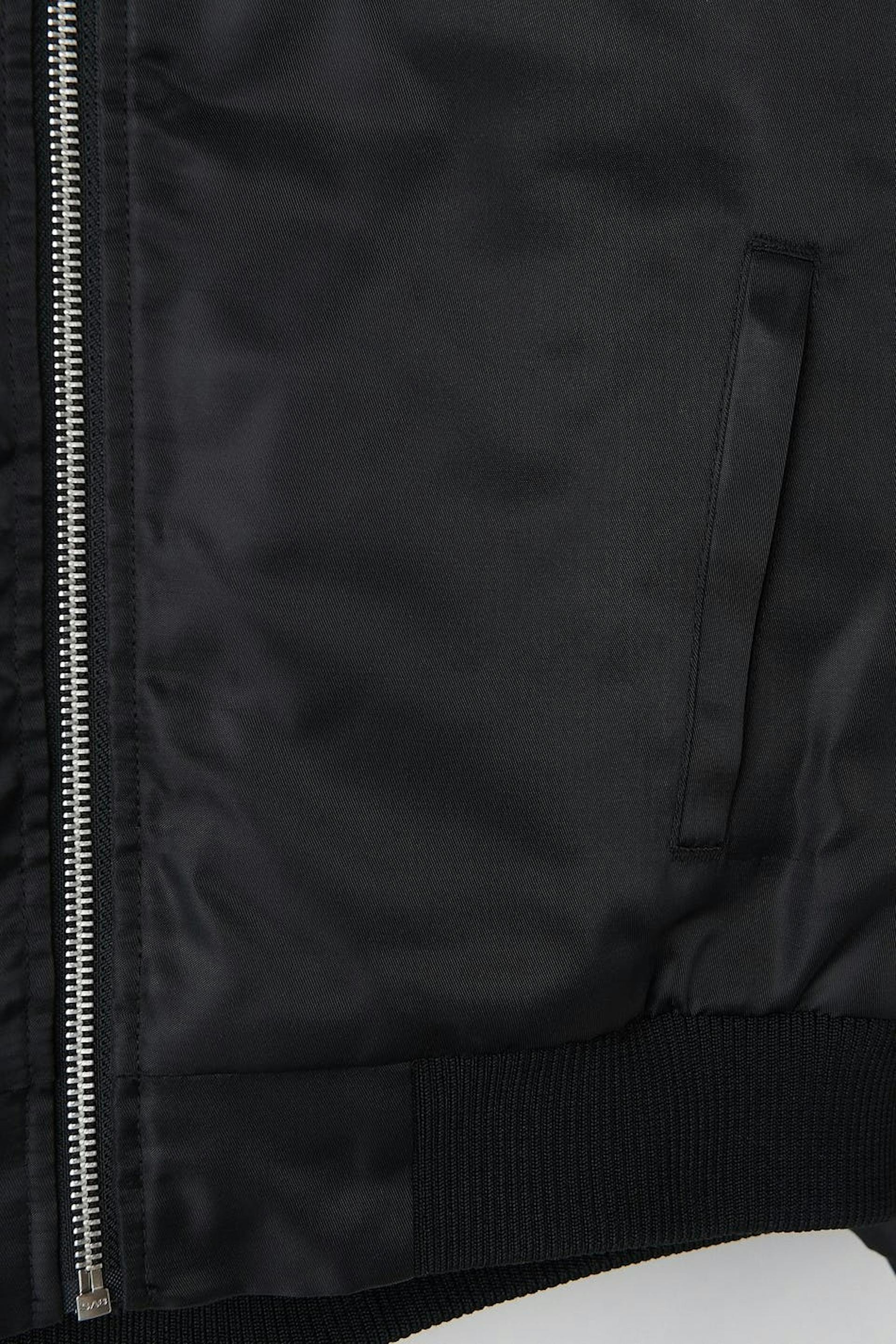 Croppad bomberjacka med knäppning fram. Jackan är svart och har resår nedtill och vid ärmsluten.