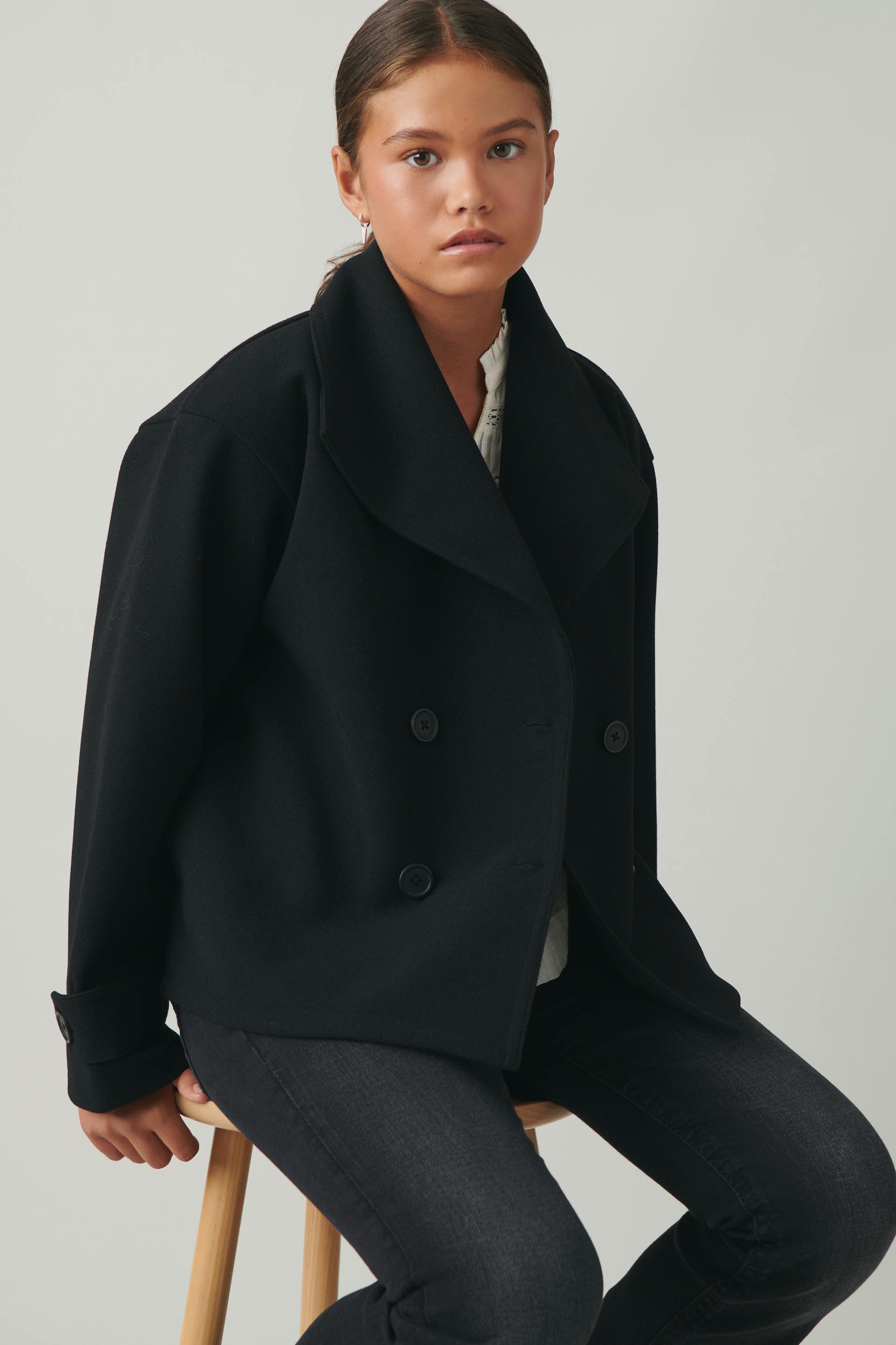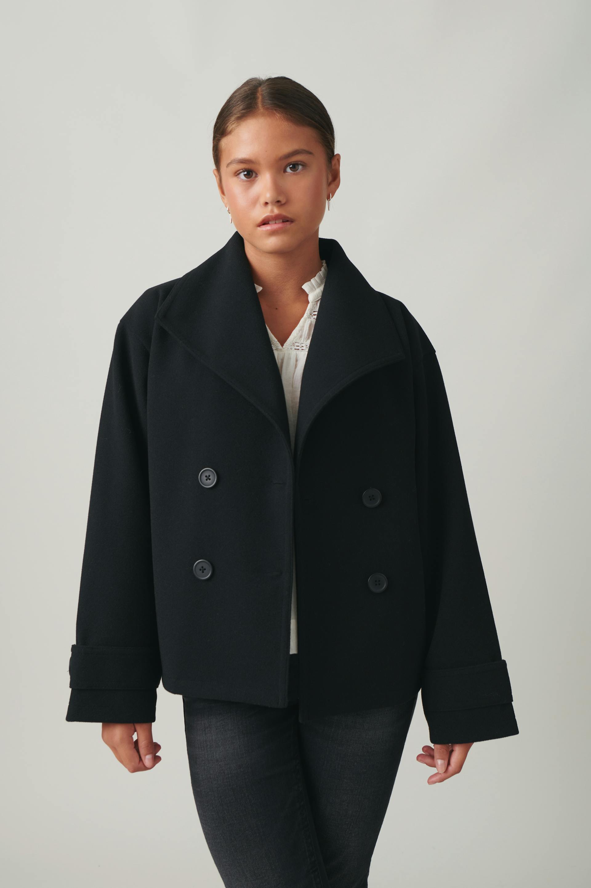 Kort kappa med oversize fit. Kappan är svart och har knäppning fram. Den har fickor i sidorna, lång ärm och nedhasad axel. Ofodrad.