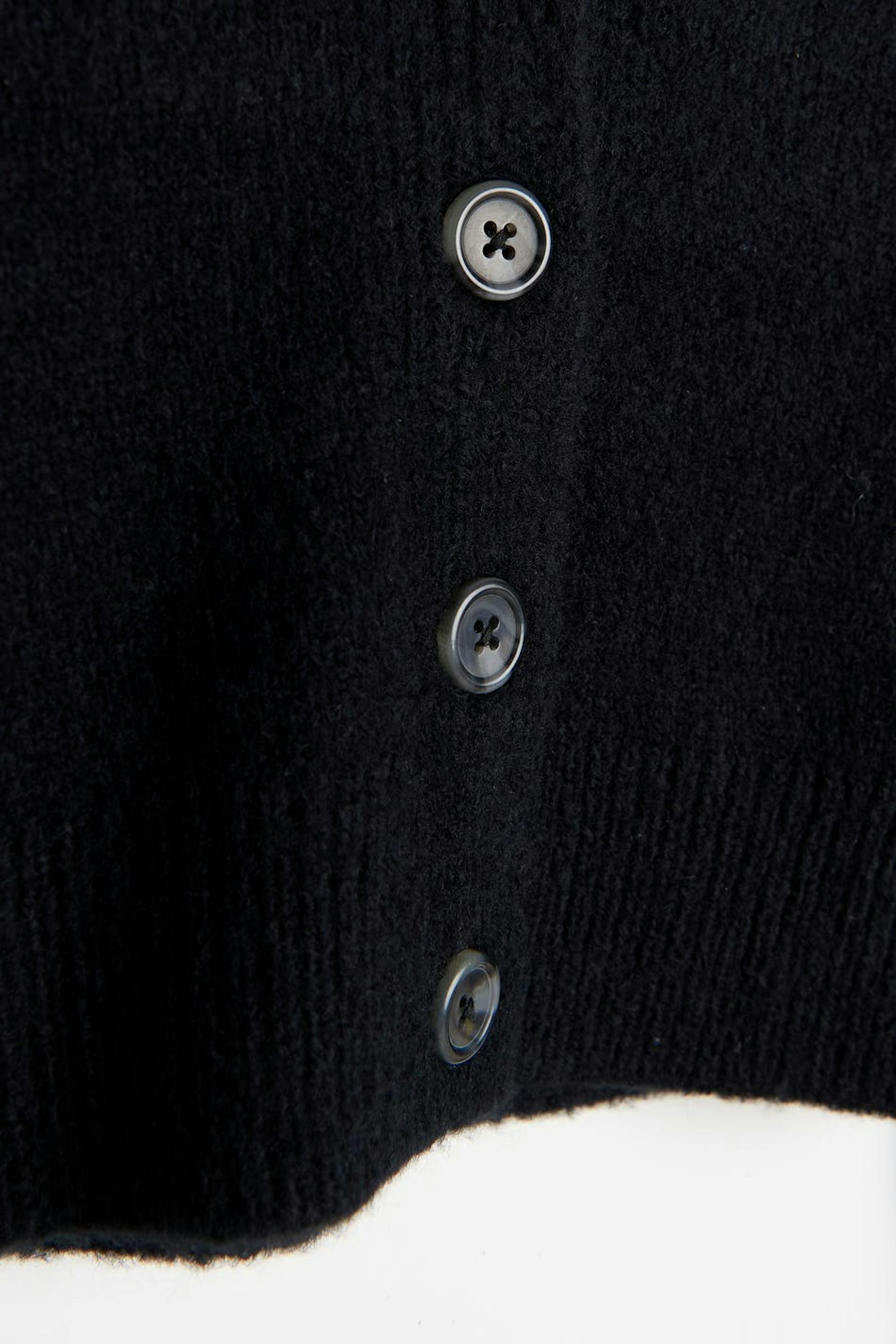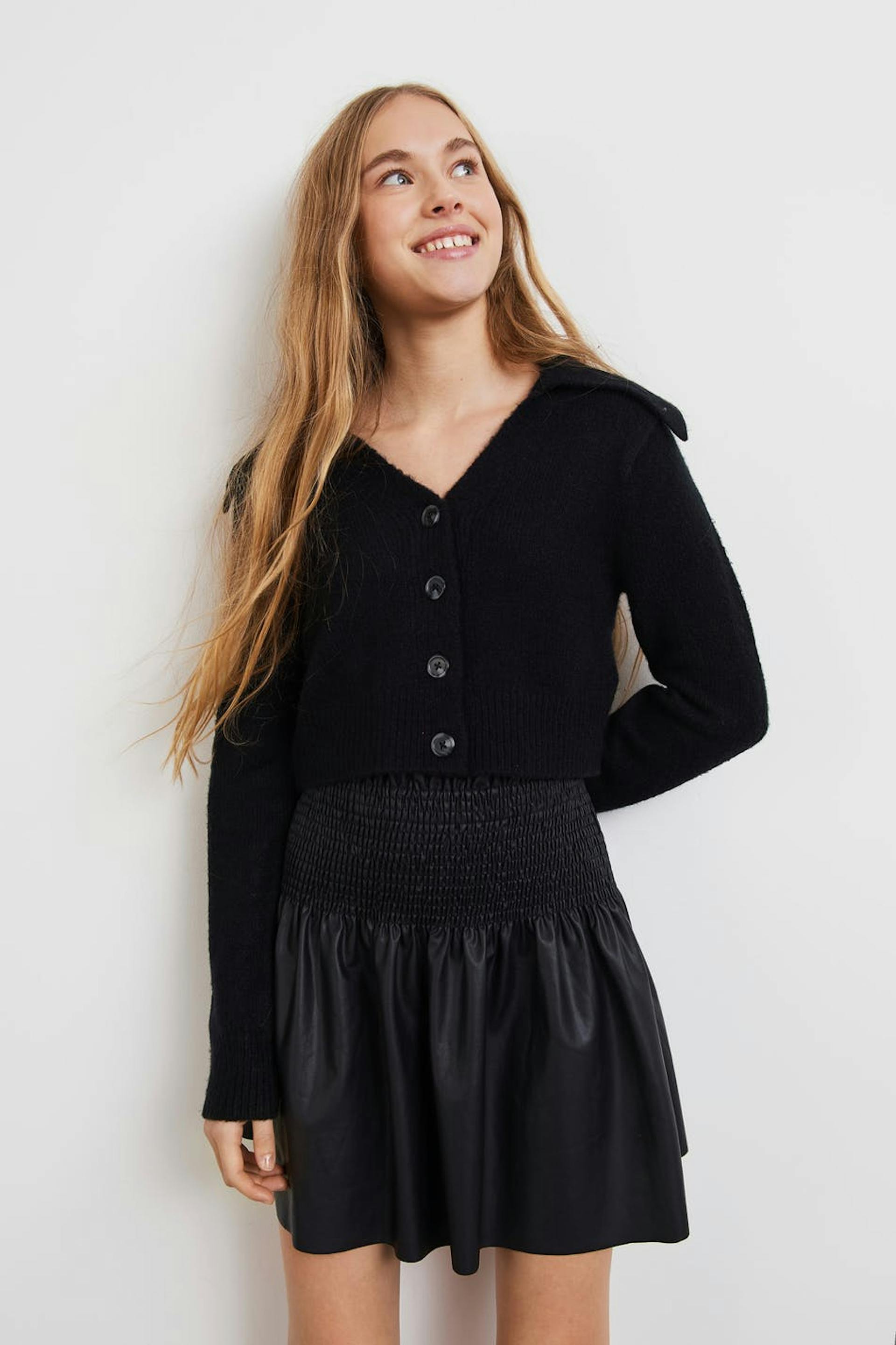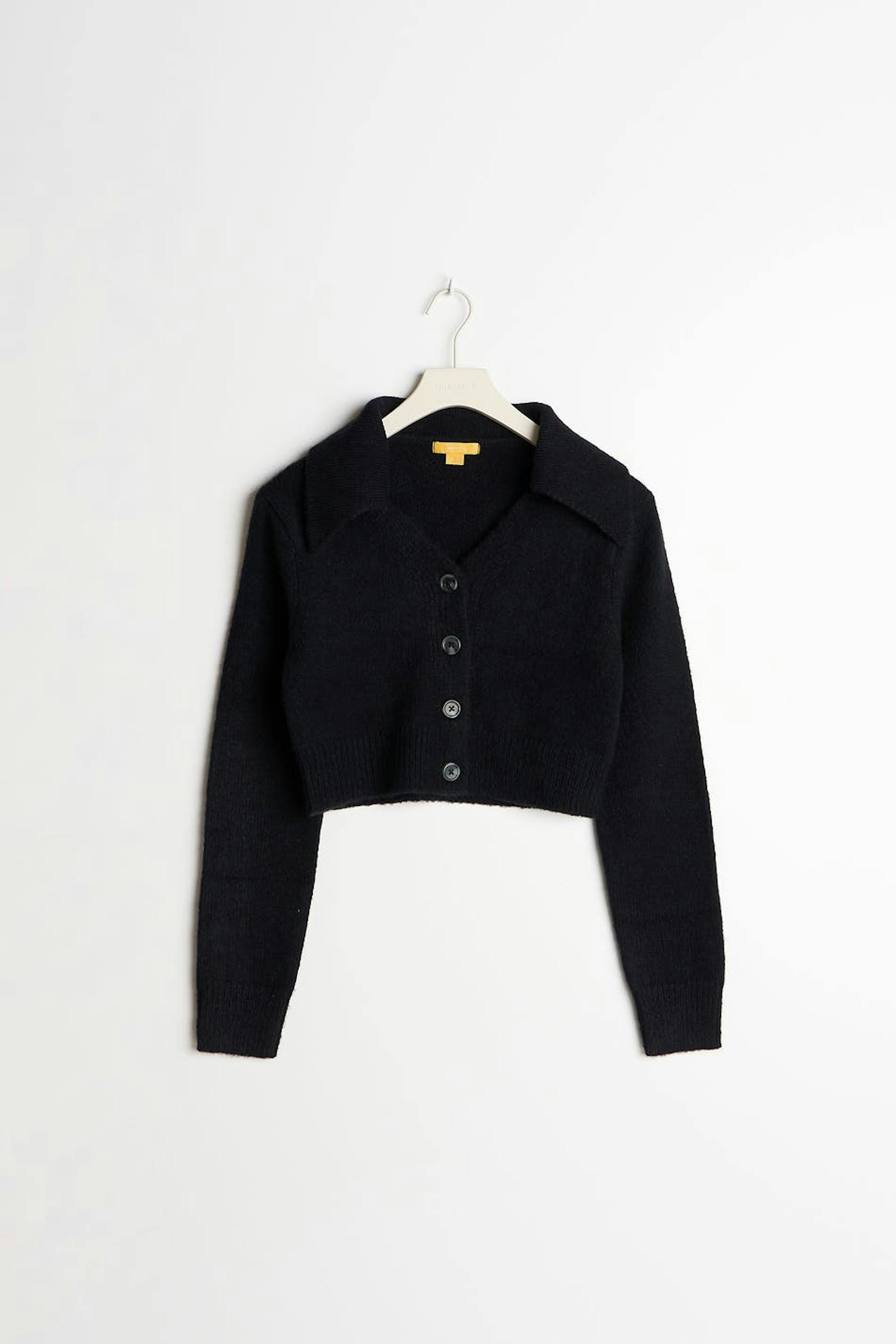 Stickad cardigan från vårt Young-sortiment med stor krage. Cardigan är svart och har en figurnära passform. Den har v-ringning, knäppning fram och en croppad längd.