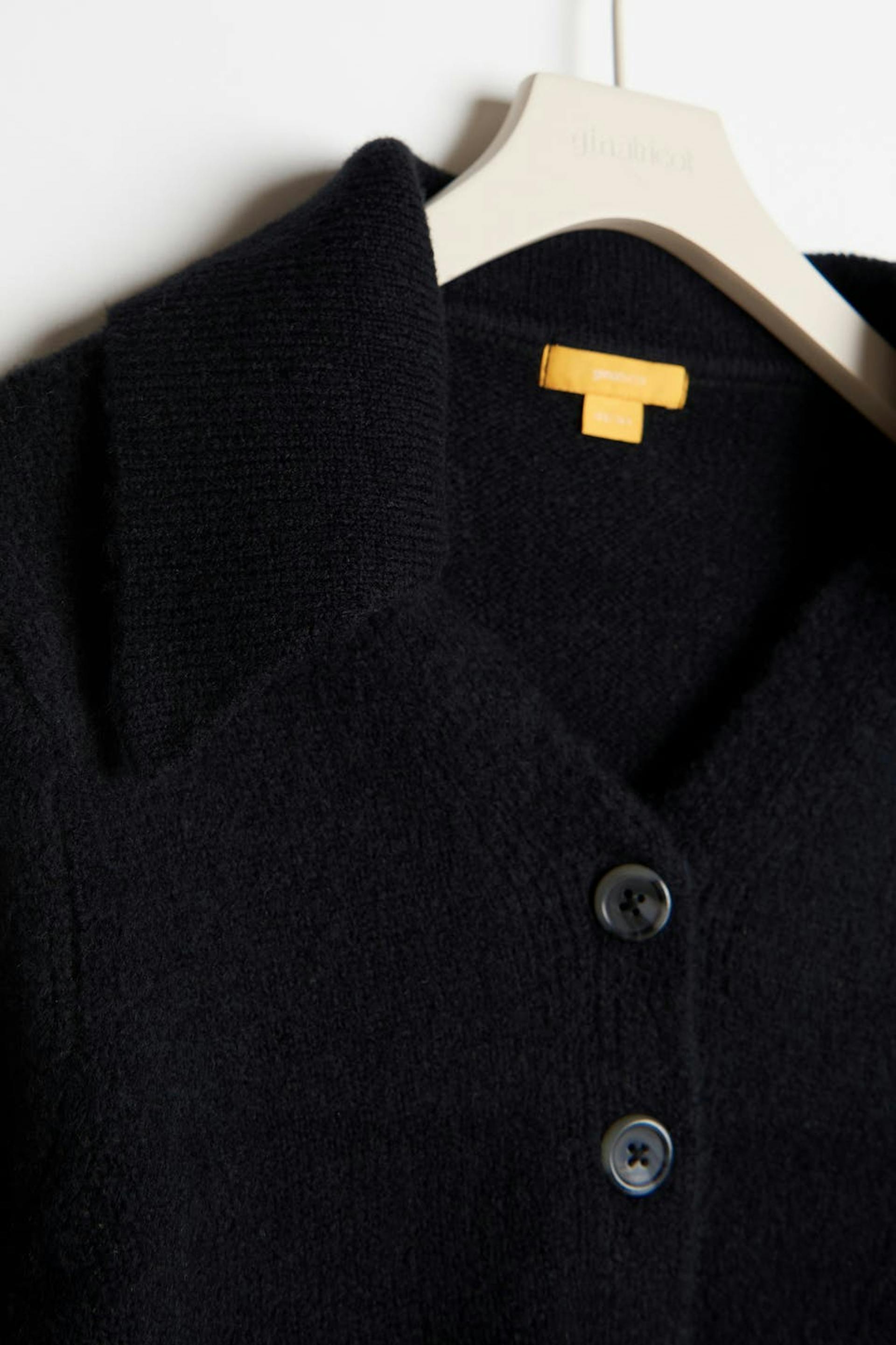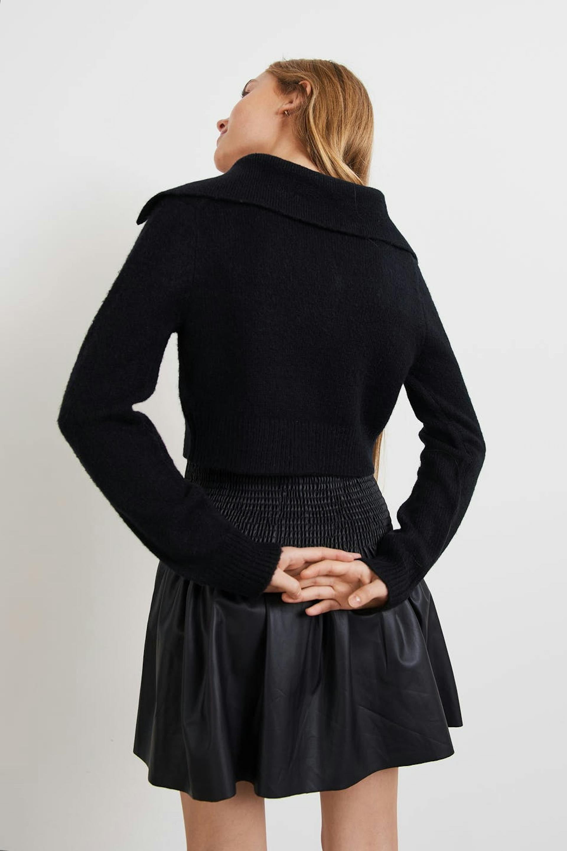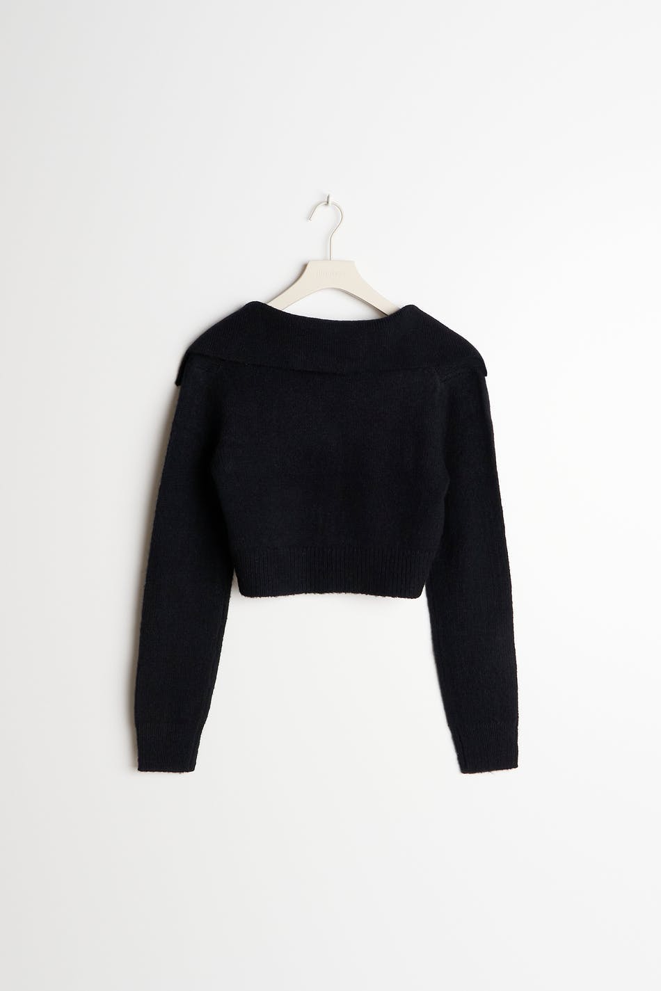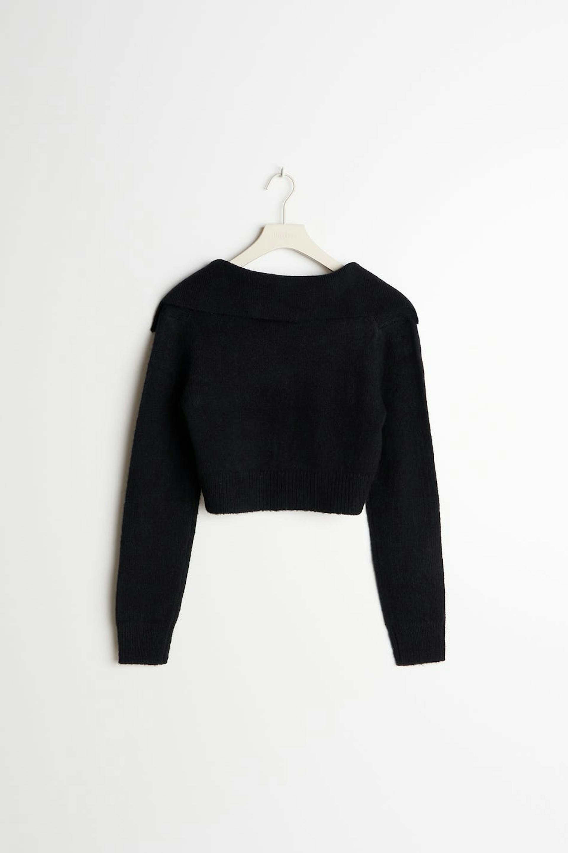 Stickad cardigan från vårt Young-sortiment med stor krage. Cardigan är svart och har en figurnära passform. Den har v-ringning, knäppning fram och en croppad längd.