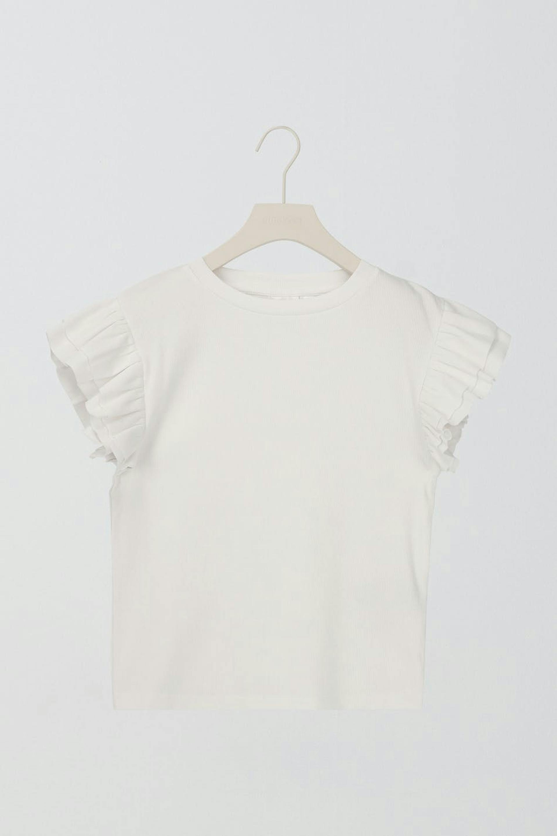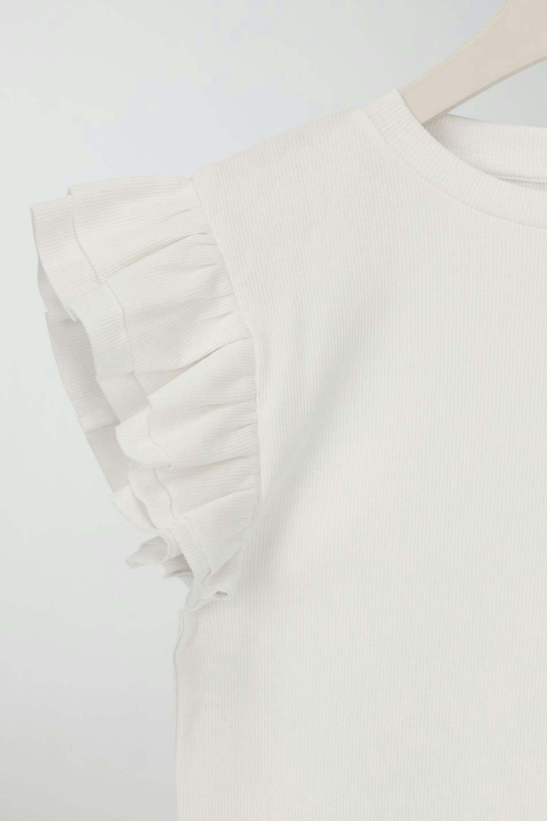 Topp från Gina Tricot Young i trikå med korta volangärmar. Toppen är vit och har en ribbad kvalitet.