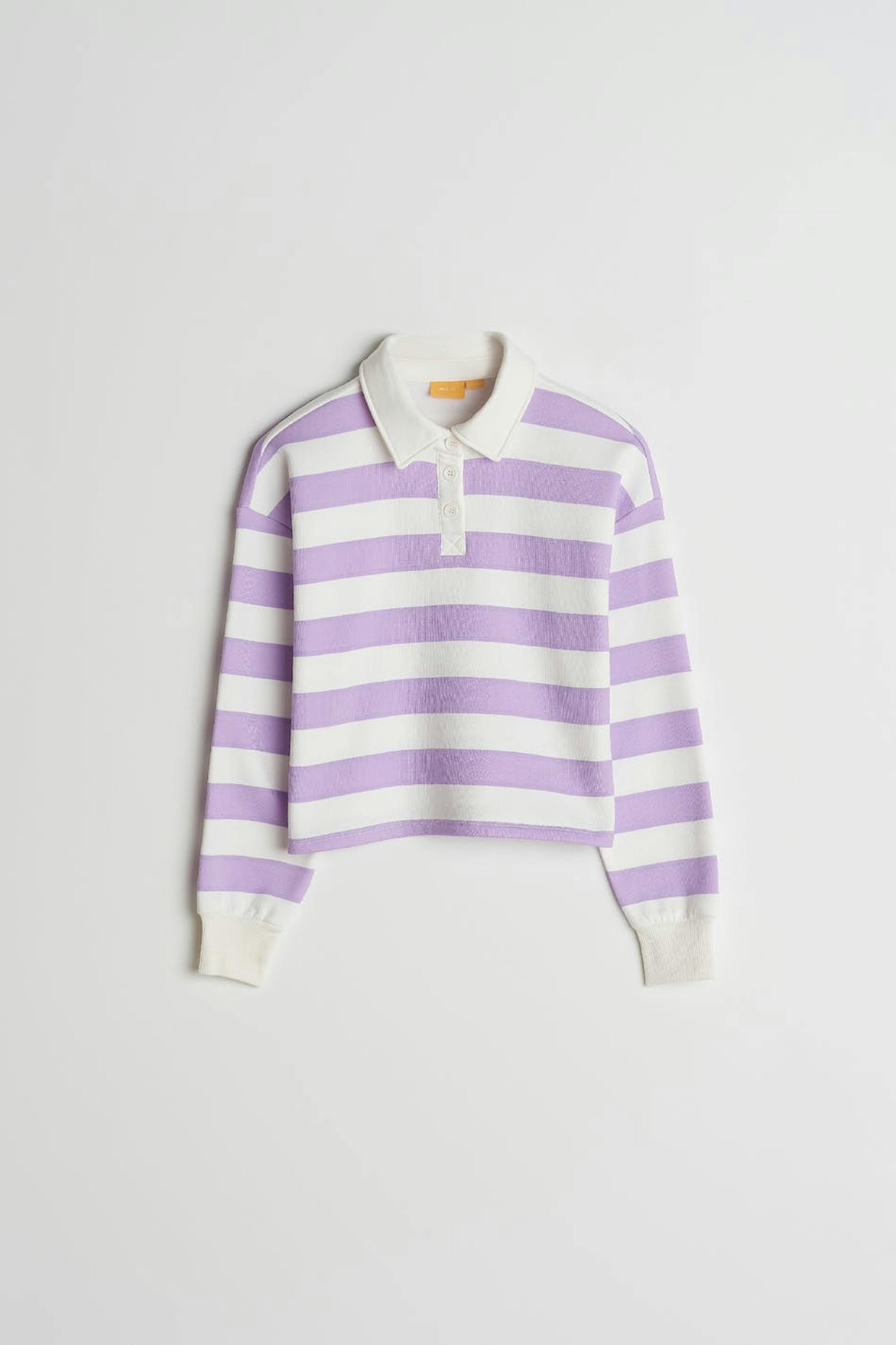 Randig sweatshirt från vårt Young-sortiment med oversize fit. Sweatshirten är lila, vit och långärmad. Den är gjord av trikå och har en skjortkrage, knappar upptill och en ribbmudd vid ärmsluten.