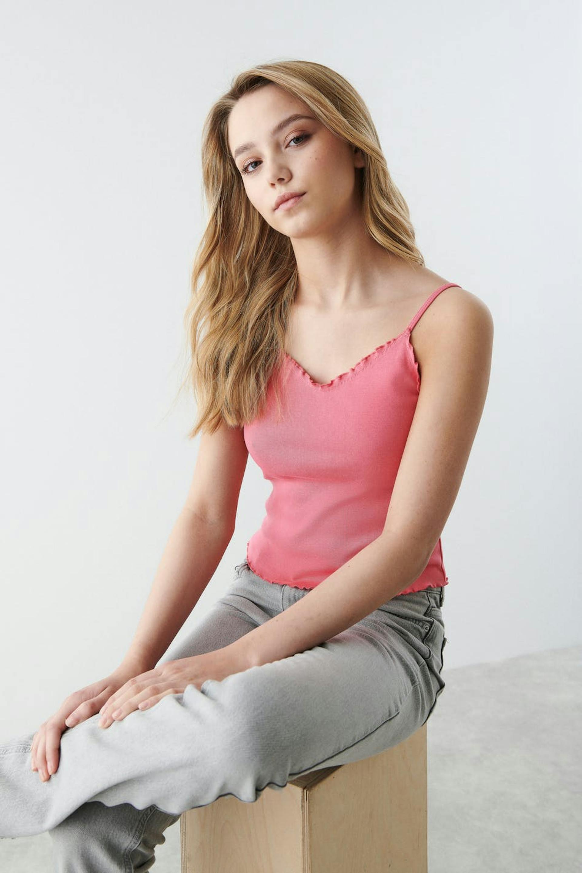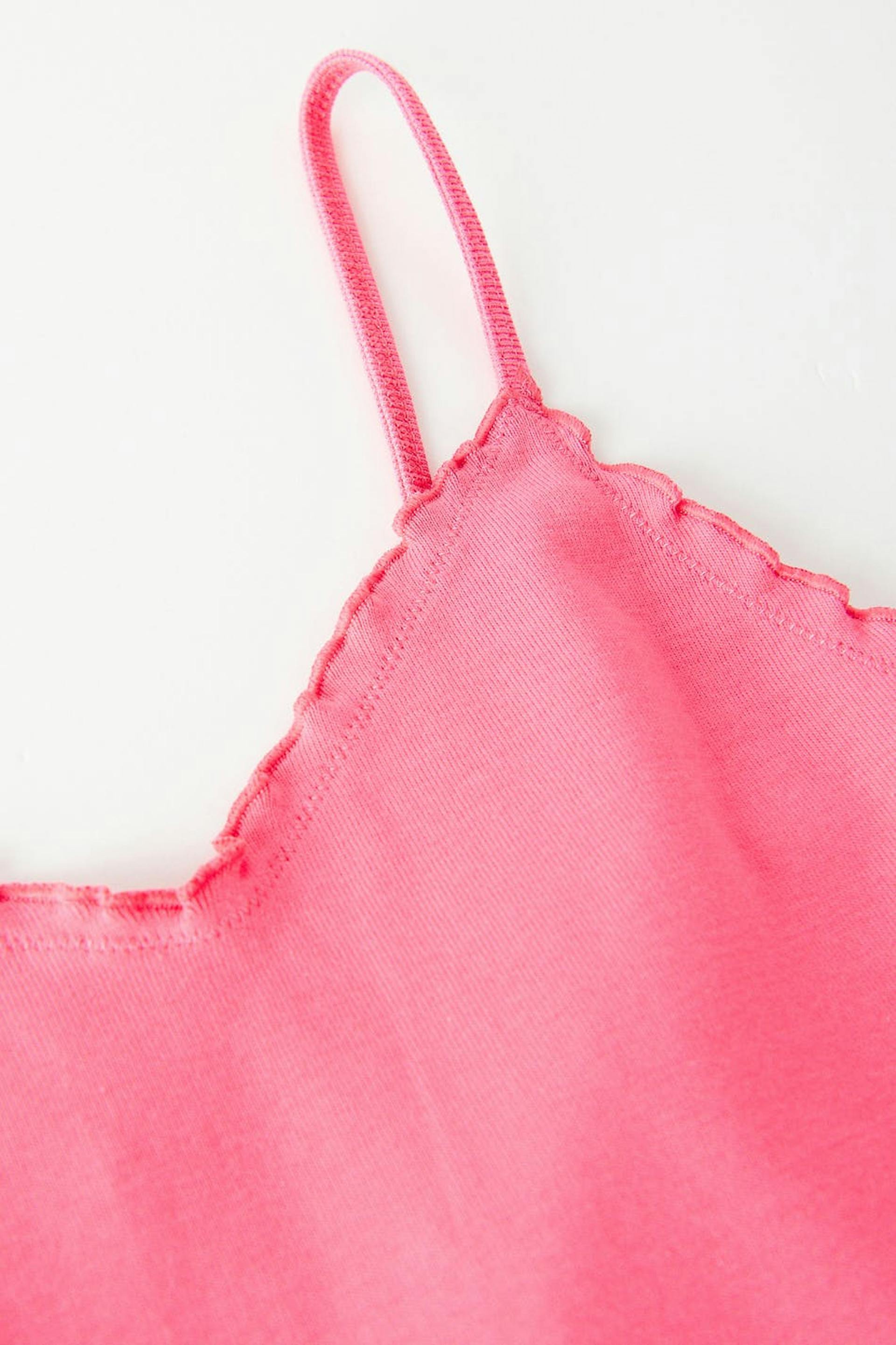 Croppat linne i trikå med v-ringning. Linnet är rosa och har en figurnära passform. Det har tunna axelband och lockade kanter.