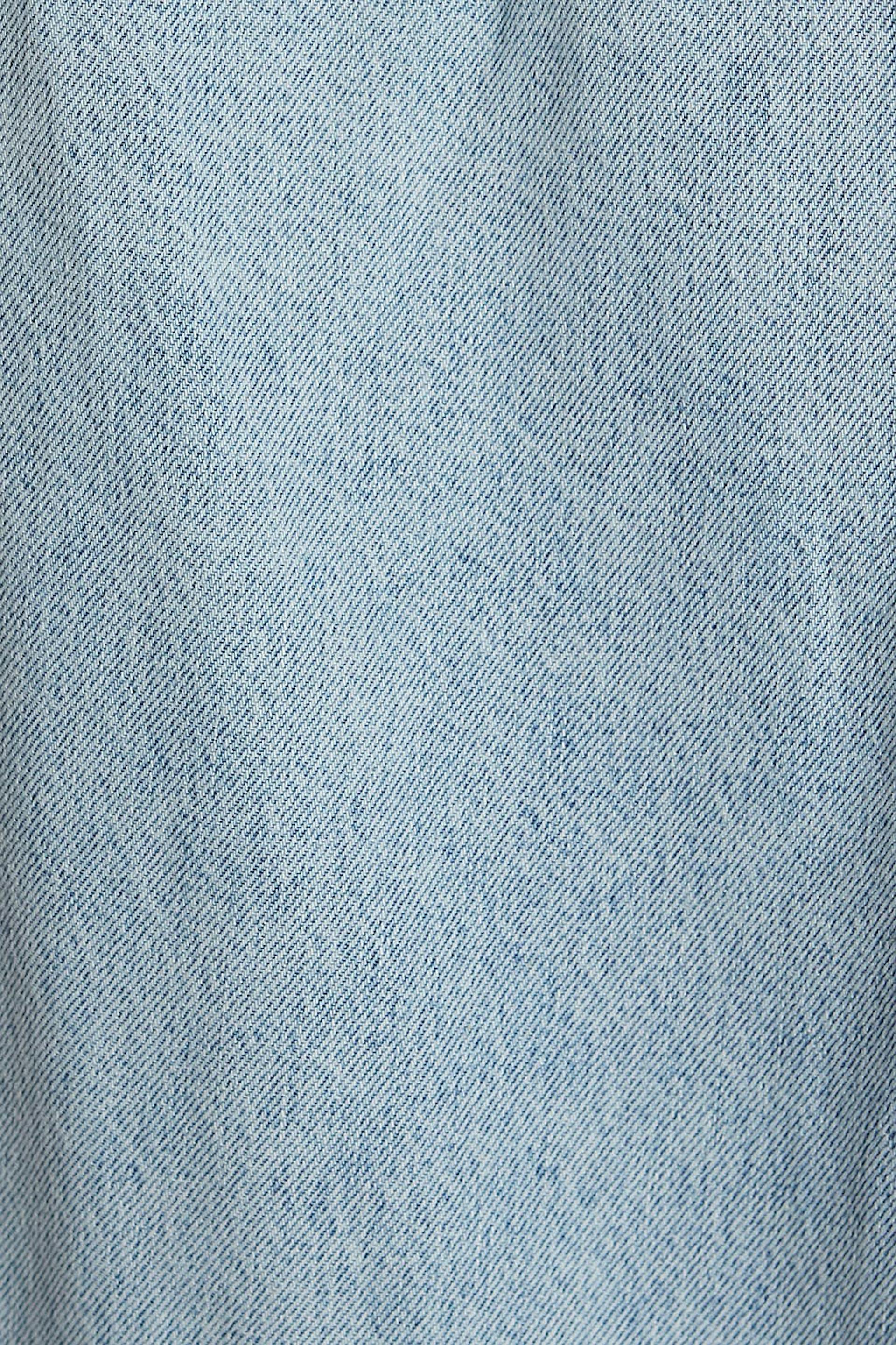 Mom jeans with a regular fit. The jeans is light-blue and blue and has a high waist. It is made of denim and has tapered, ankle-length legs and a fly.